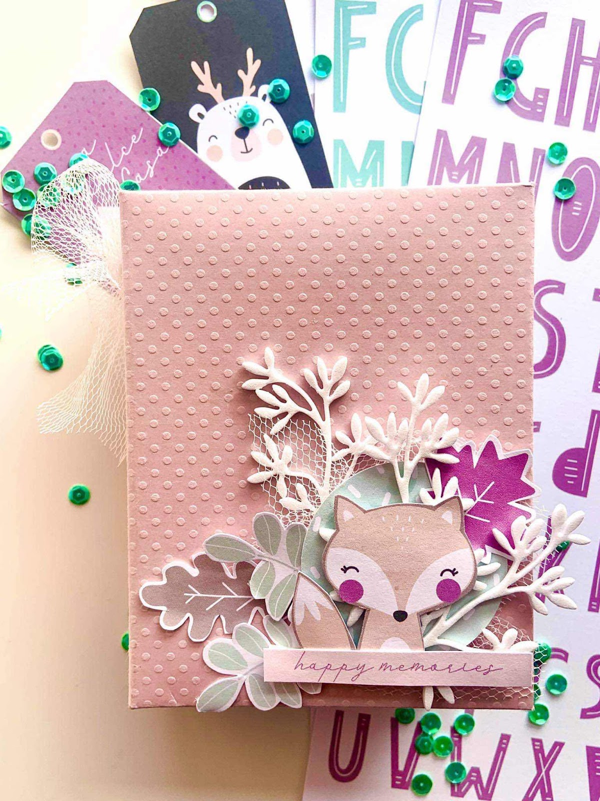 Il mini è molto molto semplice con la classica struttura con rilegature ad alette e mi sono divertita da matti a ritagliare animaletti, foglioline e lettere dei fogli abbinati alla collezione di carte. E ve lo dico: ve li dovete assolutamente comprare!